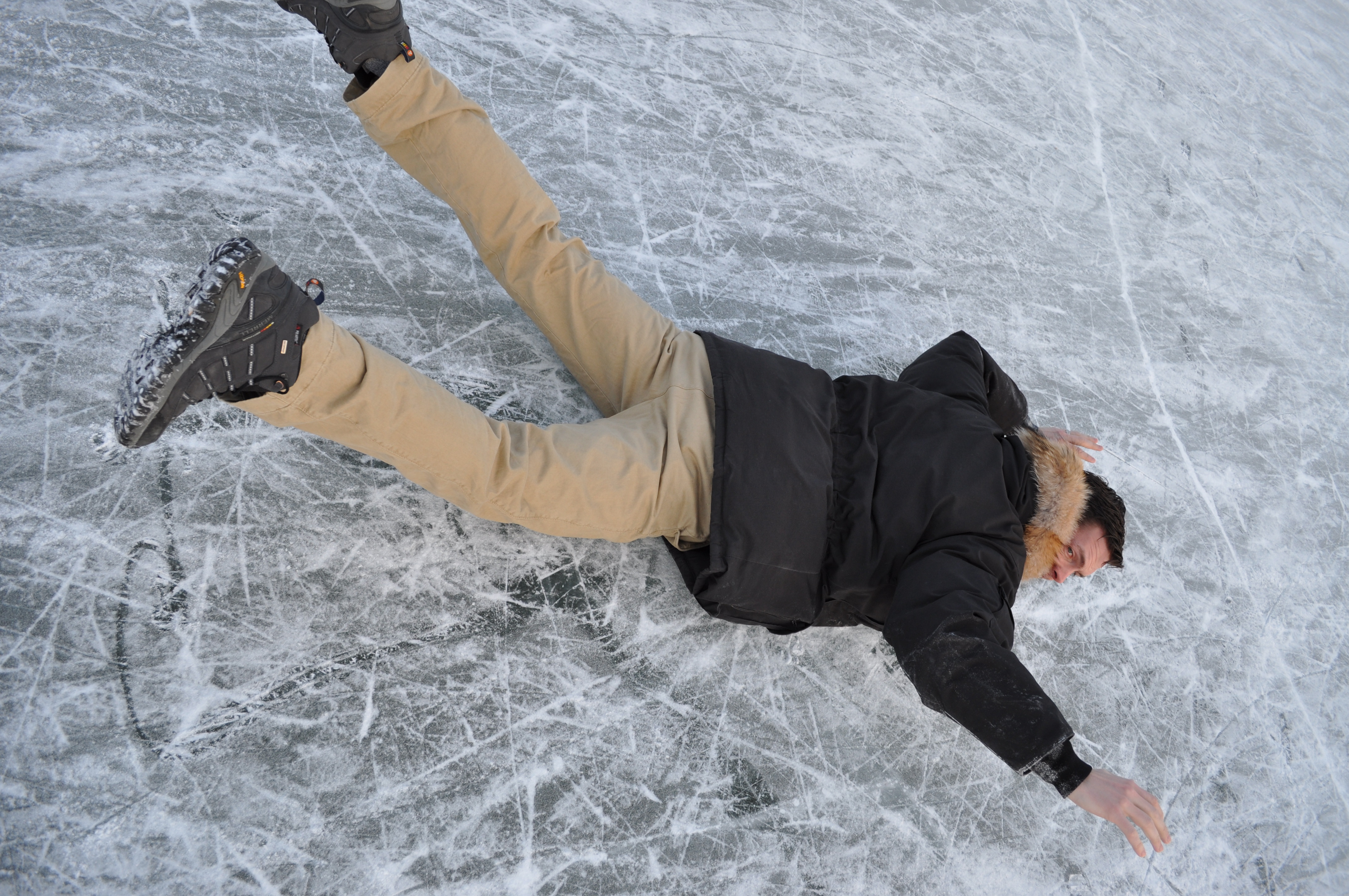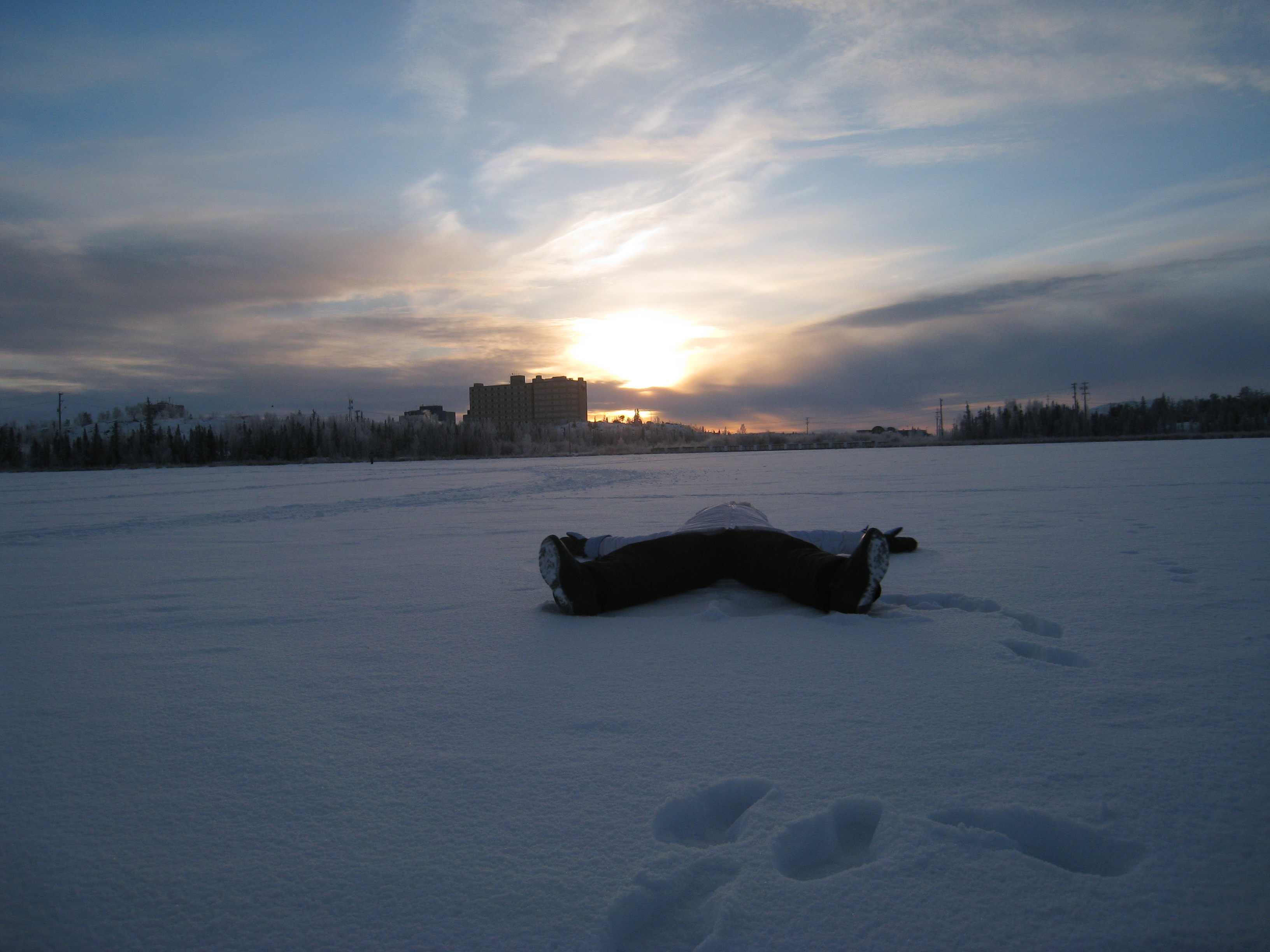 This is a beautiful winter day. The sun is setting over the city skyline, my friend is making a snow angel on the lake just out side of my house.