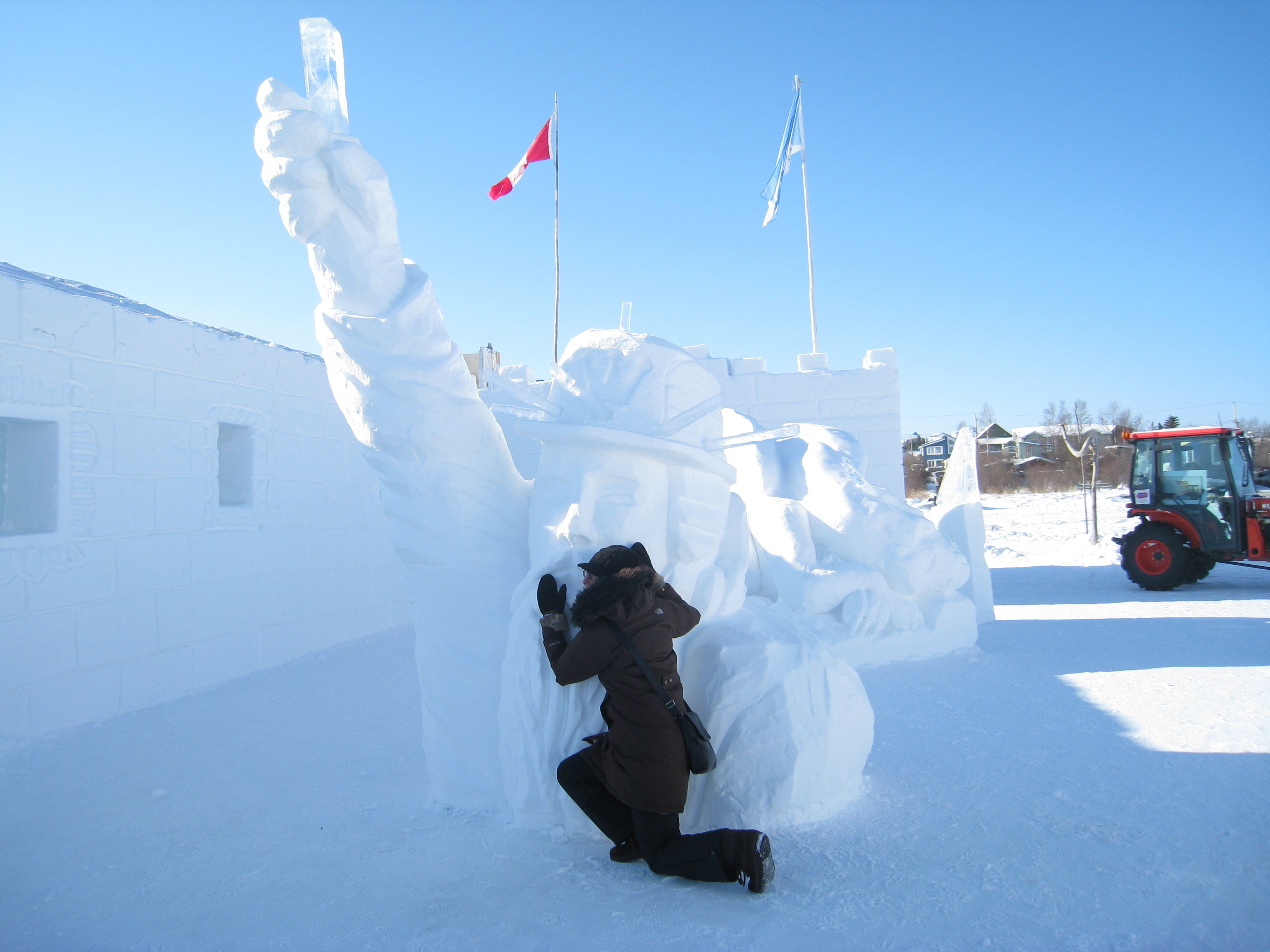 Ah, yes, the snow castle. Every year around Christmas the Snow King…. I don’t know this man by any other name, will begin to build a large ice castle. When it is done (March 1st, every year) it houses art shows, concerts, weddings, etc. Local artists will carve pretty patterns into the walls or create ice sculptures. This is an homage to the Snow King himself and my friend, apparently, loves him!