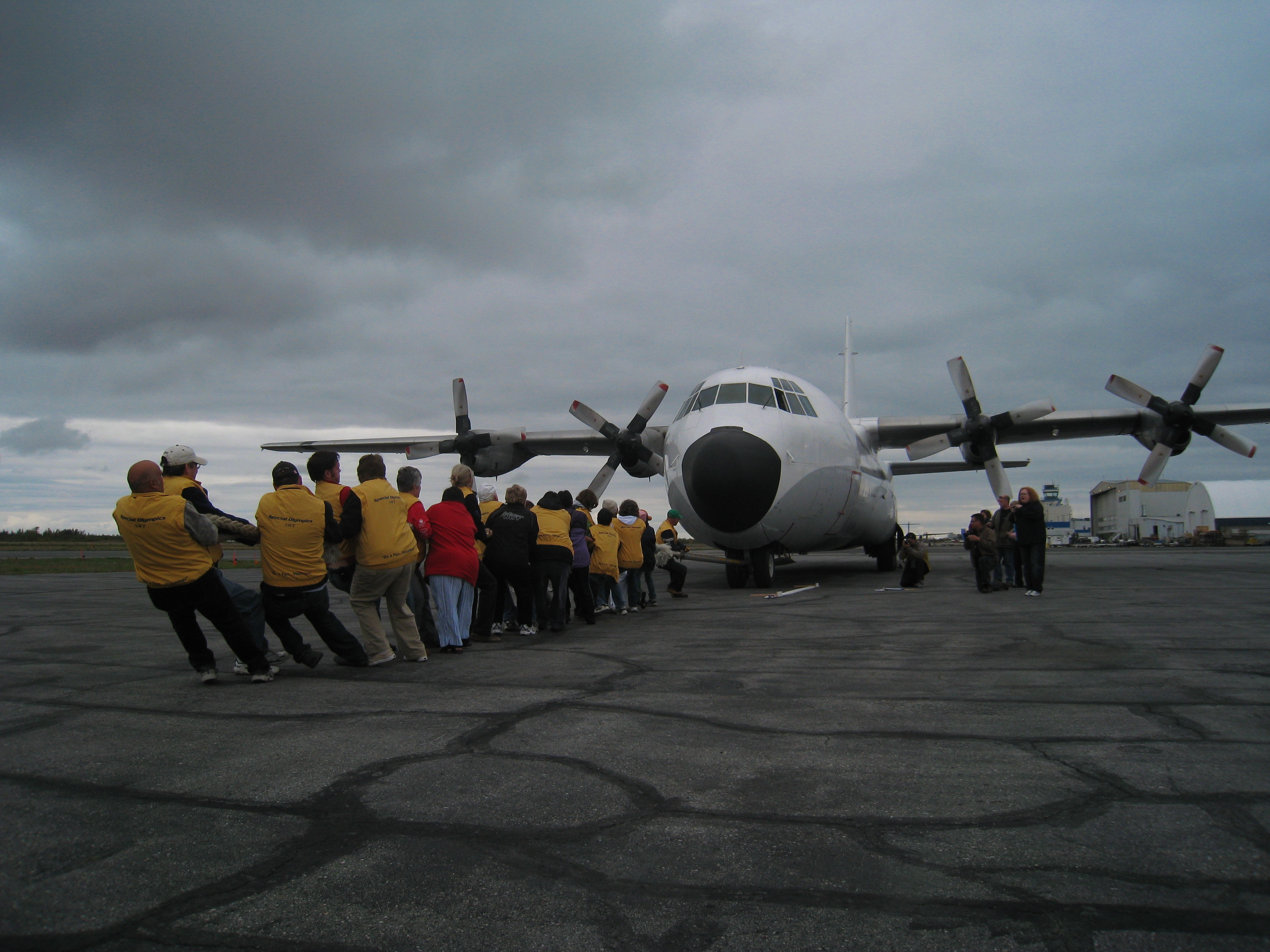 The two main industries in Yellowknife are Mining (as of late, diamonds, previously gold) and Government (federal and territorial). I’d venture a guess that the third industry is aviation. There are a lot of ‘outfits’ here in town that will fly you and your equipment out to mine sites, hunting lodges, etc that are not accessible by land. This picture is actually of a Fundraiser for the Special Olympics. Teams compete to pull the herc. a certain distance in the fastest amount of time. (for those that watch Ice Pilots, they fly hercs. on that show.)