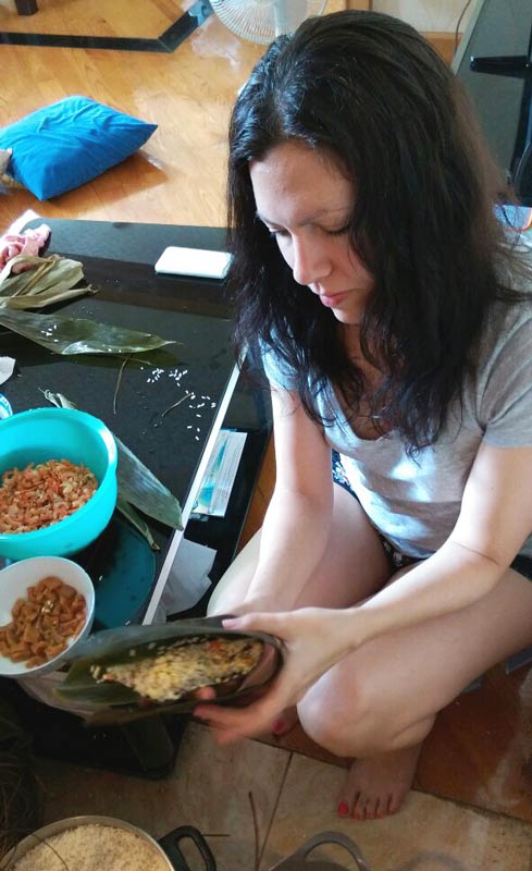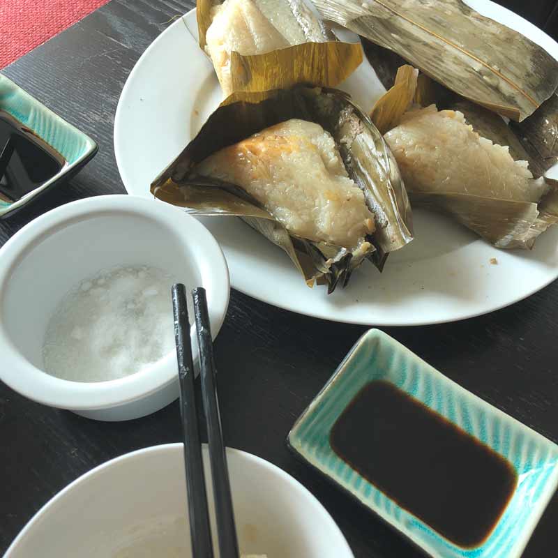 Here is a handy link for very specific instructions, if you’re really interested in trying to make sticky rice dumplings on your own: Zongzi Chinese Bamboo Leaf Dumplings (The name is different because of the different Chinese dialects, in Cantonese it’s pronounced ‘jong’ and in Mandarin it’s pronounced ‘zongzi’).